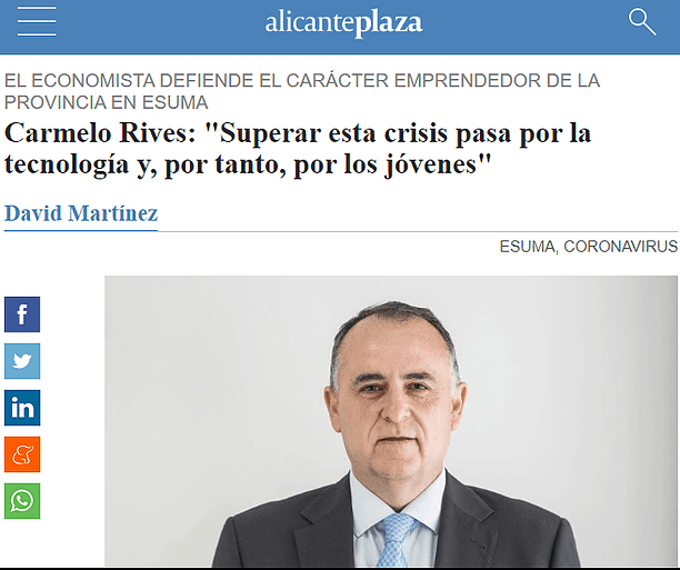 Durante la entrevista, realizada por Carmelo Hurtado, director de Esuma Business School, Rives aseguró que el incremento del paro provocado por el cierre de la actividad está creando «la peor crisis económica a la que España se ha enfrentado en cien años», aunque por el lado positivo también apunto que «tanto las empresas como los hogares están mejor preparados para una crisis que en 2008». Según explicó Rives, se trata de una crisis de oferta y demanda. Y para enfrentarla, a su juicio, hace falta tener una Europa fuerte. «Salir de Europa es una locura, Europa es muy competitiva y puede unida salir de esta crisis reforzada». Asimismo, el economista destacó que la provincia de Alicante saldrá adelante «porque es tierra de emprendedores». Una capacidad para adaptarse y salir adelante que «han demostrado muchas veces. Alicante era tierra pobre, y en pocos años nos convertimos en una de las provincias líderes del país, produciendo, exportando y creando un sector turístico que no existía».