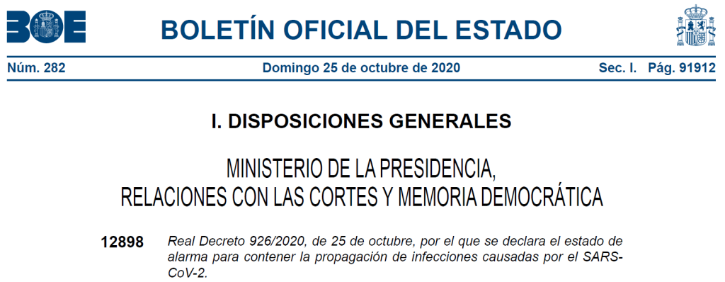 Real Decreto 926/2020, por el que se declara el estado de alarma para contener el SARS-CoV-2.