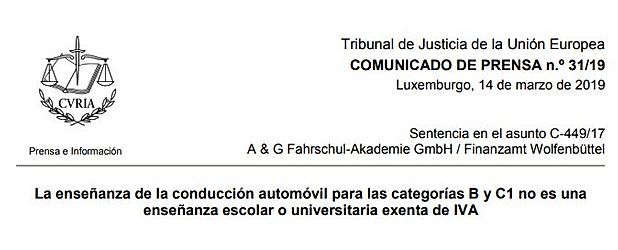 El Tribunal Supremo de lo Tributario, Alemania pretende saber si el concepto de «enseñanza escolar o universitaria» cubre la enseñanza de la conducción automóvil en cuestión. Mediante su sentencia, el Tribunal de Justicia da una respuesta negativa.