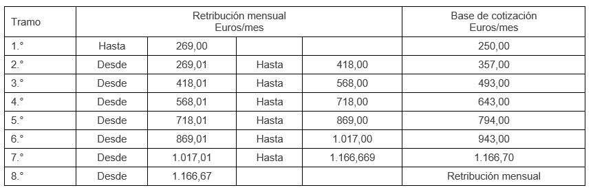 La escala de RETRIBUCIONES MENSUALES y las BASES DE COTIZACIÓN en el Sistema Especial para Empleados de Hogar establecido en el Régimen General de la Seguridad Social del AÑO 2023, será: