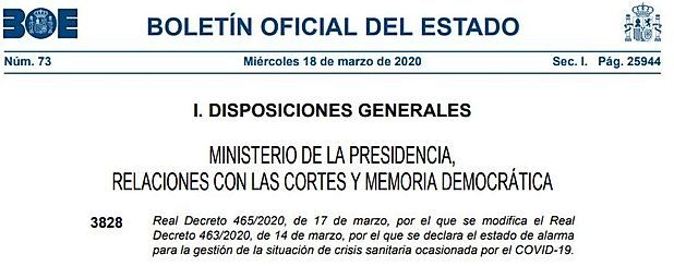 El RD 465/2020, de 17 de marzo, modifica el RD 463/2020, estableciendo que la suspensión de los términos y la interrupción de los plazos administrativos a que se hace referencia en el apartado 1 de su DA 3ª no será de aplicación a los plazos tributarios, sujetos a normativa especial, ni afectará, en particular, a los plazos para la presentación de declaraciones y autoliquidaciones tributarias.